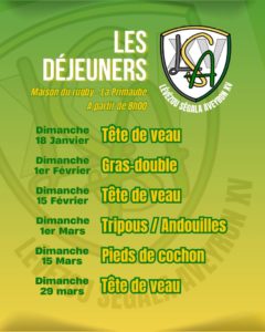 Les déjeuners du LSA XV : Comme tous les ans en Janvier, les déjeuners du LSA XV font leur retour. Préparés par le "Club des Supporters", ils ont lieu tous les deux dimanches, et ce jusqu'à fin mars. Retenez bien les dates sur le menu ci-dessous. Rendez-vous sans réservation, à…